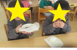 今日はにこにこえがお組(4歳クラス)が、クッキングでごぼうを使って「ごぼうサブレ」を作りました。