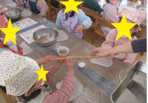 粉がしっかりと混ざったのを先生や栄養士の先生に見てもらったら、これから成形です♪