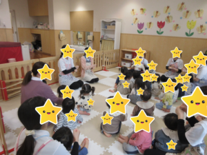 誕生児の紹介があり、名前を呼ばれると少し恥ずかしそうにしながらも、みんなから「おめでとう」とお祝いの言葉をかけてもらいました。その後、手遊び「トントントンあんぱんまん」をみんなで楽しみ保育教諭の真似をしたり、手を叩いたりしながら笑顔いっぱいの時間となりました。