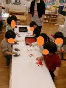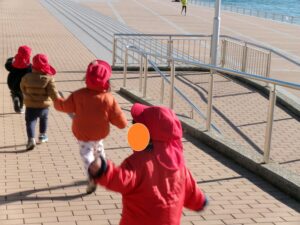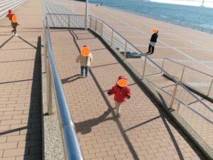 寒さに負けず、大好きな消防車や救急車を見に、市役所裏の海岸へ。スロープで走ったり、海の景色を楽しんだりしました。製作遊びでは、絵具のぬたくりに挑戦。いろんな茶色を自分で選び、手のひらで塗り合わせたり、画用紙の上で色を混ぜたり、絵具の感触を楽しみました。
