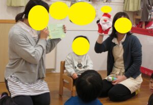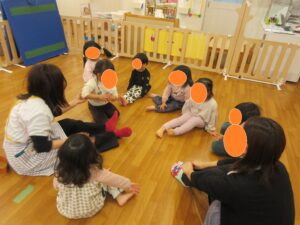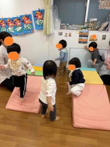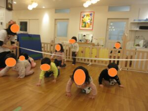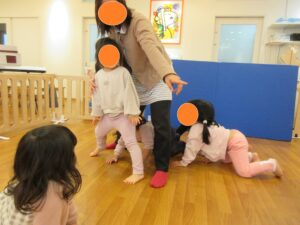 友だちと一緒にリズム遊びをしました。保育士の真似をして足トンネルする係とをくぐる係に分かれて遊んだり。、わらべ歌で縄くぐりをしたりして遊んでいます。絵本をもとにごっこ遊びをしています。動物になって遊んだり、楽しんでいますよ。