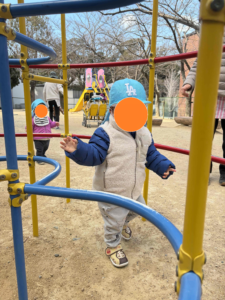 体を動かすことが大好き!歩行も体幹も安定してきたので、階段の上り下りや平均バランスウェーブやマットにジャンプ、バギーなしで保育士と手繋ぎ散歩など、いろんなことに挑戦しています。