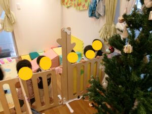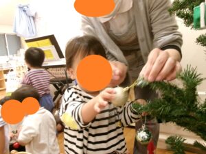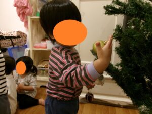 ツリーのライトをつけると「おー!」と喜んでいました。ツリーの近くを通るたびに、飾りに触れ、キラキラを眺めています。