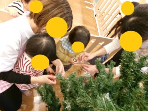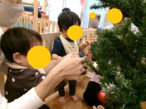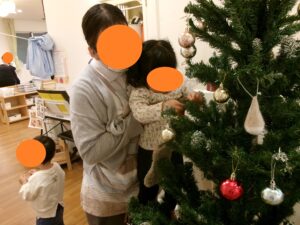 クリスマスに向けて、クリスマスツリーに飾り付けをしました。丸いオーナメント。キラキラなオーナメント。