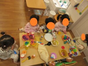 ままごとごっこでは、みんなでパーティー!赤ちゃんを連れたお母さん役の子もいます。