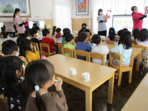 今回の歯みがき教室は、”はあもす・こども矯正歯科クリニック”の職員の方が来園され
